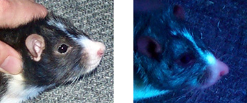 Cricket's nose looks pure white under a normal light (left). Under a fluorescent black light (right) his muzzle glows pink. |