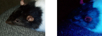 Snip's ears are a normal tan color under normal light (left), but under a fluorescent black light (right) they look violet. |