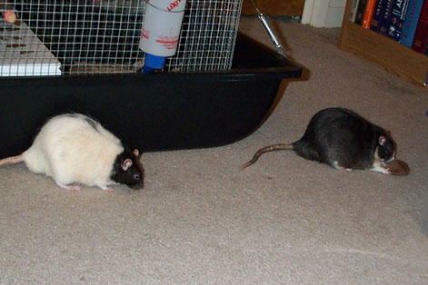 I put Cricket and Snip back in their cage and give Widget a chance. He finds the bits of shell and tastes them. |