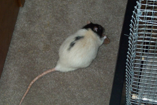 He rounds the cage corner and finds the nut! He grabs it and runs across the room with his treasure. |